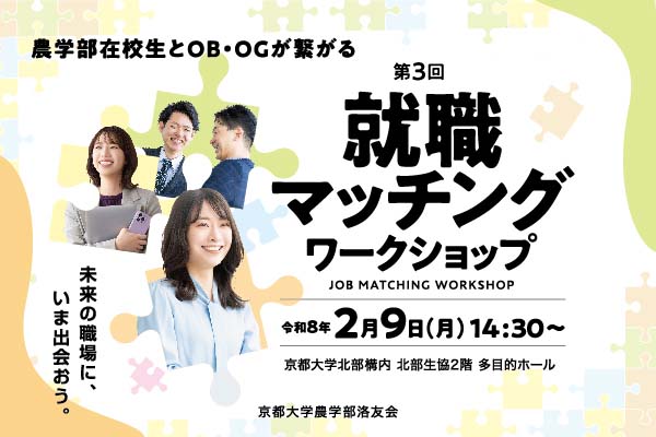 また、本企画の主催は農学部洛友会で食料・環境経済学科、生物資源経済学専攻の同窓会です。この学科・専攻は農学部・農学研究科にありながら文系の学問領域です。そのため、いわゆる「文系職」の採用を視野に入れてご出展されている企業・団体 様が多い傾向にあります。こうした背景から、文系学部の学生・大学院生の方の就職活動との親和性が高いと思われます。文学部、法学部、経済学部、教育学部、総合人間学部などの文系の学生・大学院生のご参加も歓迎いたします。