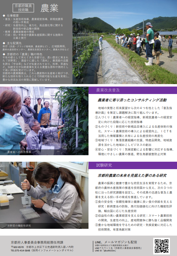 さらに、京都府の農業職は「京野菜」「酒米」「宇治茶」といった、伝統文化に結び付いた農産物の生産者を支援し、京都の歴史、伝統を未来に継承することに貢献できます。